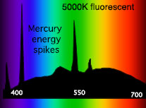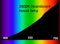 Below are two spectral distribution charts. Very simply, you can deduce from the smooth diagonal of the incandescent bulb that its colour rendering is more predictable than fluorescent lighting (LED is similarly disadvantaged). This benefit is offset by the strong red bias, which subdues violet and blue colours and is controllable in modern technologies.