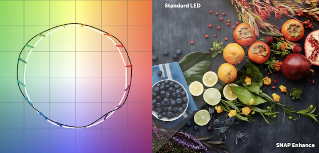 Colours are rendered much more vibrantly with Soraa compared to other artificial light sources because its spectrum offering is complete, matching or even exceeding the natural spectrum of daylight, but without any of the harmful ultraviolet radiation and continuous variations that come with natural light sources.