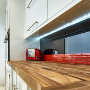 Often in the kitchen you’ll be working in your own shadow, especially at outer worktops. Under-cabinet lighting solves this by delivering light straight to the surface. Tagra Warm White LED Strip Light is practical, stylish and creates mood.
